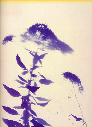 ポルトガルの作家、ルールデシ・カストロの作品集『影の植物園』より。これは、感光紙を使って、草や花やいろいろな植物の葉っぱなどに光をあてて焼きつけた、一種の日光写真集である。具体的にどのような操作と処理を行うのか――どういう光を使って何分くらい感光させ、どのように定着させたのか等、詳しいことを私はまだ知らないが、ともあれ色々な植物のシルエットが右ページに載っており、左ページの左上隅にはラベルが印刷されていて、その植物の学名と一般名および原産地などが書いてある。図鑑あるいは標本集の体裁である。